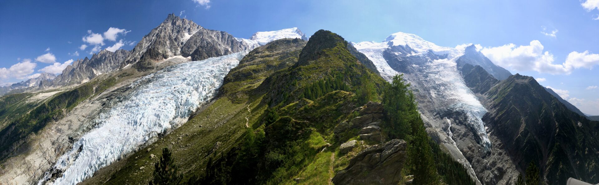 Randonnée mythique de Chamonix, La Jonction conduit au balcon suspendu entre les glaciers des Bossons et de Taconnaz, face au massif du Mont-Blanc.